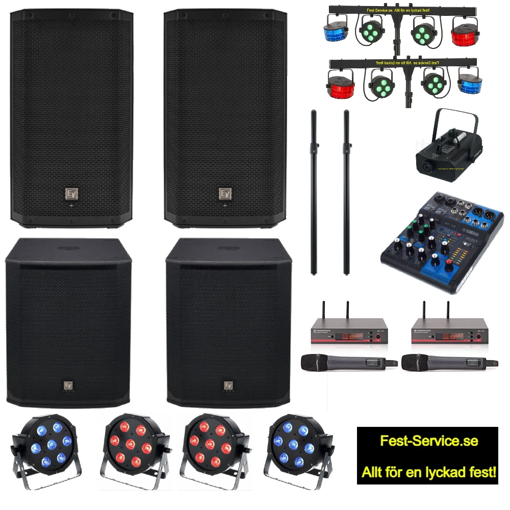 Premium ljudutrustning anpassad för max 120 personer, innehåller 2st kraftfulla aktiva premium-högtalare från EVoch 2st aktiva bas-högtalare från EV för bästa ljud.