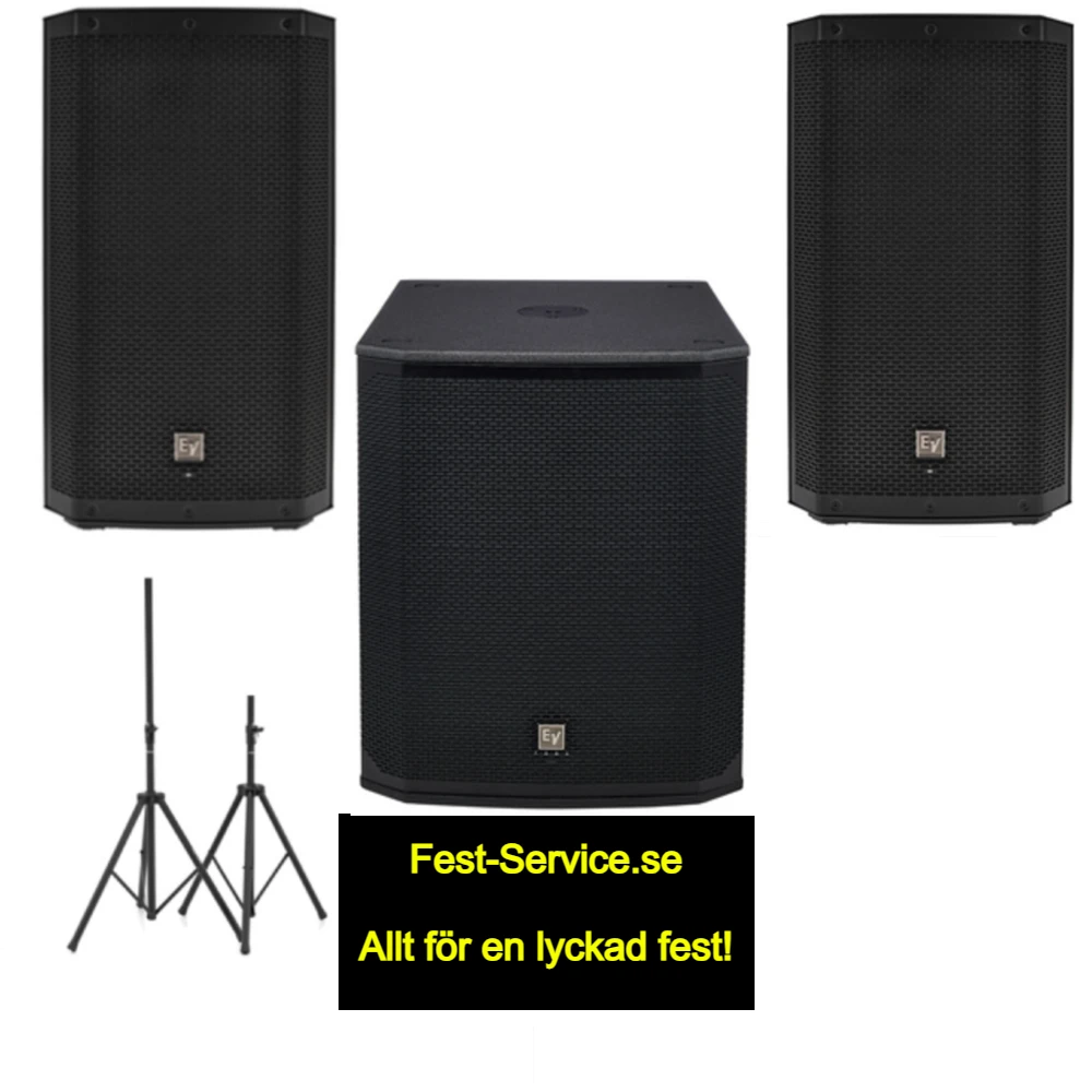 2 st 15″ kraftfulla aktiva Premiumhögtalare från EV, ZLX 15P, på 1000W, inbyggd EQ och DSP. Ingångar för XLR och tele och mic-ingång. Bara att koppla in Iphone, Mp3-spelare eller dator och höja volymen!