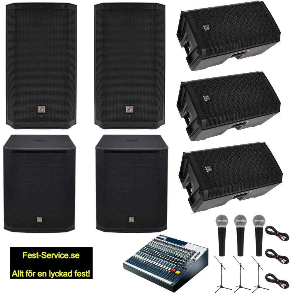 2 st 15″ aktiva toppar i trä, EV ELX115P, på 1000W, inbyggd EQ. Ingångar för XLR och tele och mic-ingång.
