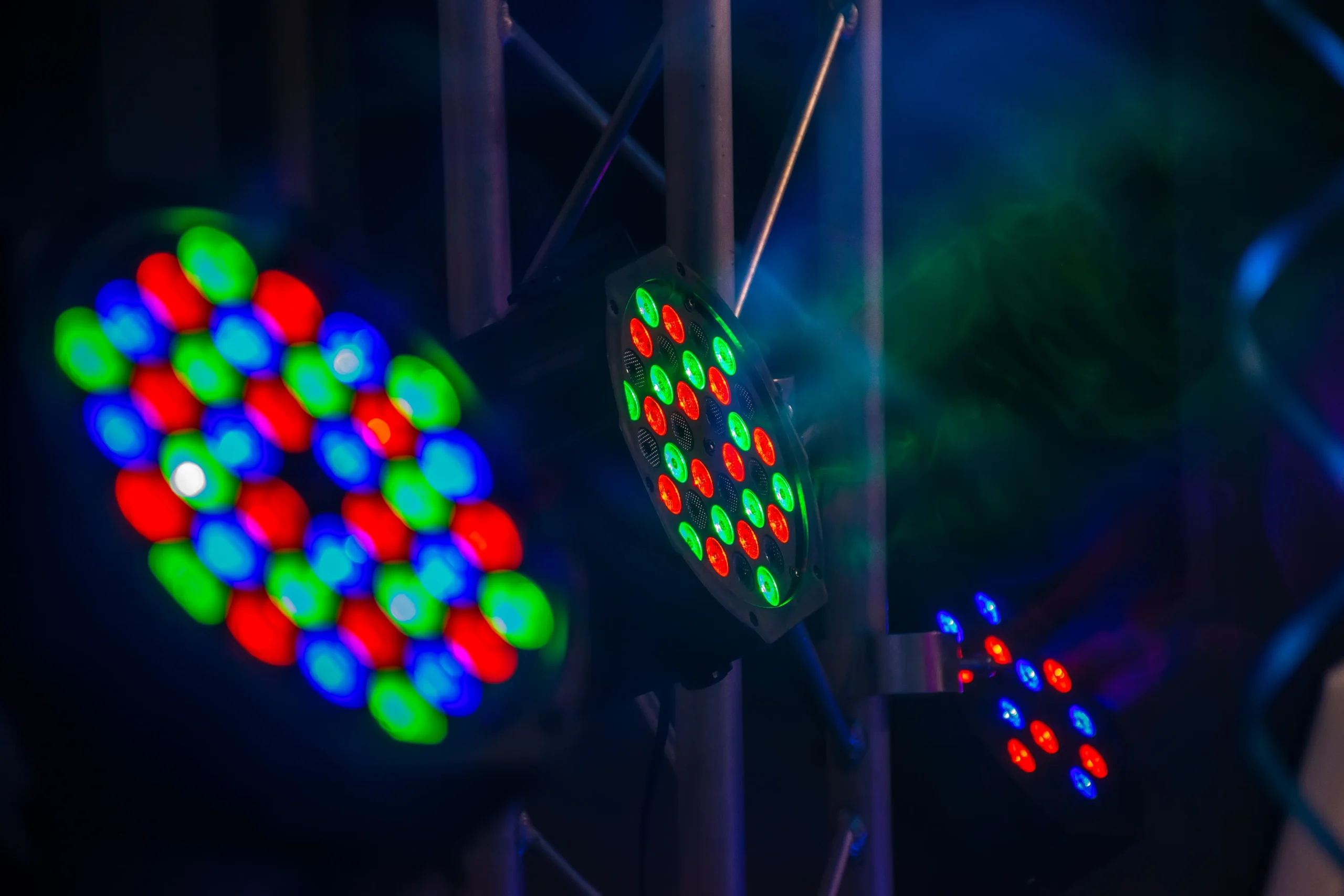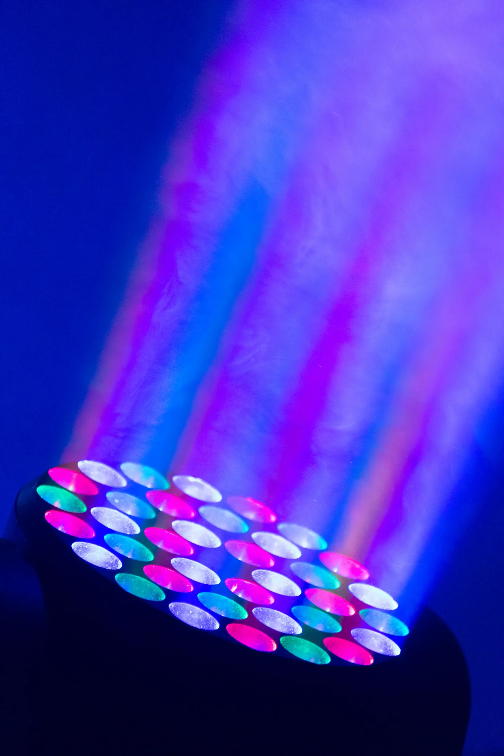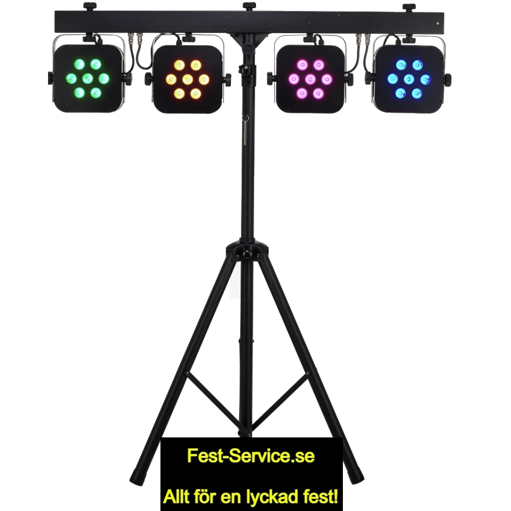 Stativ med 4 st PAR LED strålkastare. Klassisk strålkastare i LED-utförande vilket drar väldigt lite ström. Perfekt som discoljus i takt till musiken, punktbelysning, scenbelysning (mindre scener) osv. Inställningsbar för fast sken (olika färger), långsam eller snabbt blinkande i olika färger, enligt program eller till musiken. Lätt att montera och koppla in, bara att ansluta elsladden och höja volymen så sköter lamporna sig själv!