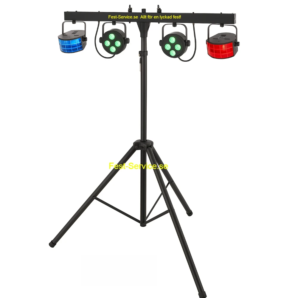 Stativ med 4 olika ljuseffekter, 4st disco-lampor som blinkar och växlar färg i takt med musiken (styrs via inbygga mikrofoner). Mycket ljus för pengarna! Lätt att montera och koppla in, bara att ansluta elsladden och höja volymen så sköter lamporna sig själv!